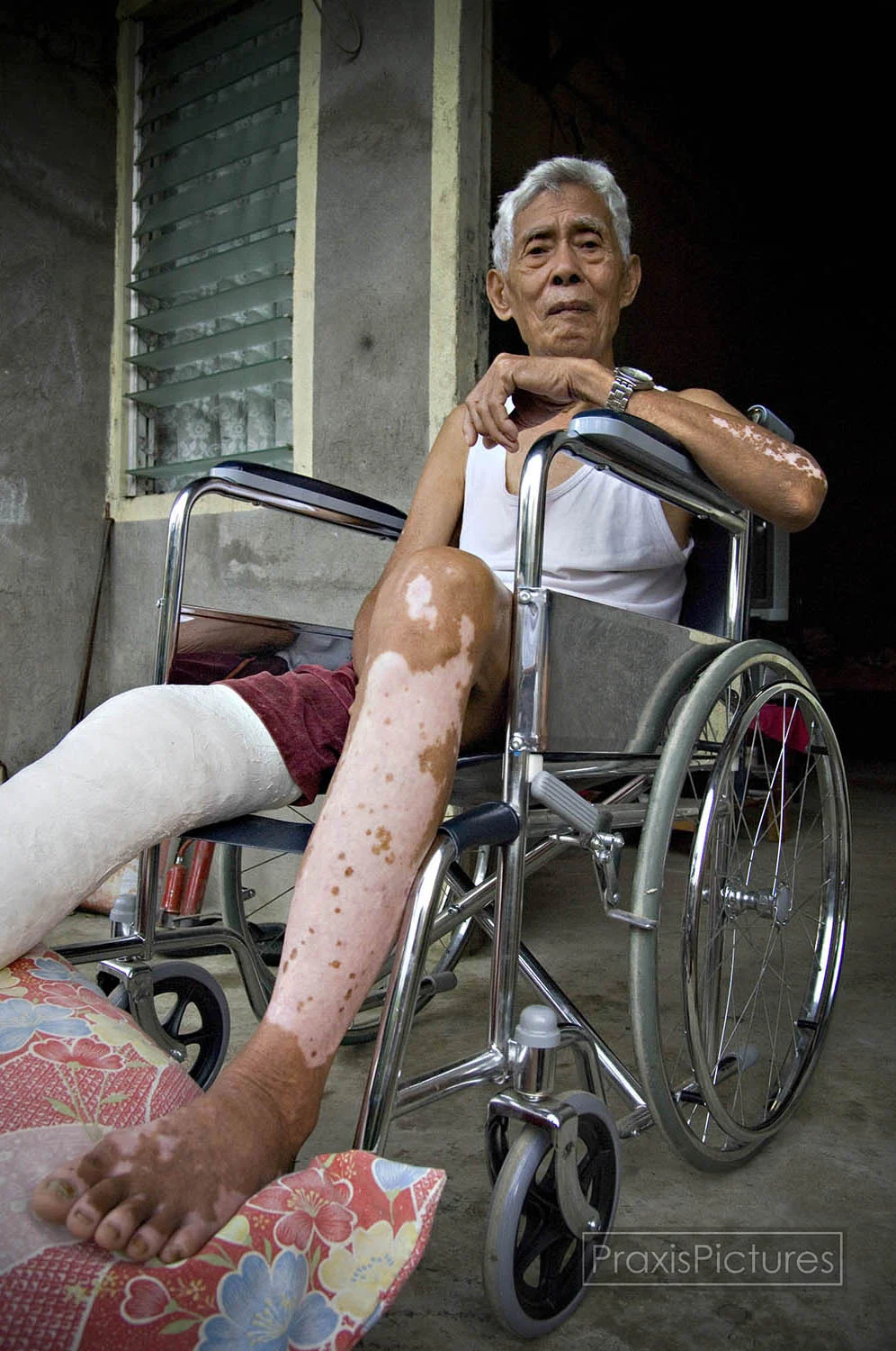 An 80 year old farmer, Thomas has spent his life providing for his family by making coconut wine and raising livestock. Thomas has baithed in the Mogpog River every day since he was a baby. His body is now covered with skin discolouration which he started developing about forty years ago when Placer Dome's mine was in full operation. The island of Marinduque has never been able to afford conducting a full medical survey of the island, but smaller studies have shown that, of 59 children tested, every single one of them had unacceptable levels of lead or cyanide in their blood.
